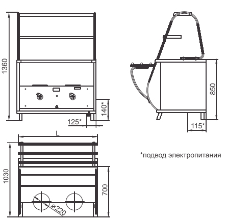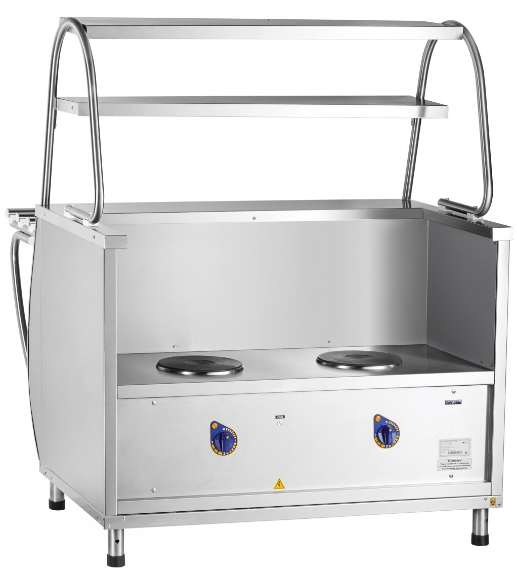Описание Мармит 1-х блюд Abat ПМЭС-70М используется для непродолжительного сохранения первых блюд в наплитных котлах в горячем состоянии, а также для раздачи их потребителям. Конфорки мармита 1-х блюд Abat ПМЭС-70М оснащены регулировкой мощности, а двойная полка над мармитом 1-х блюд Abat ПМЭС-70М оборудована лампой подсветки. На ней Вы можете выкладывать порционные блюда. Ножки мармита 1-х блюд Abat ПМЭС-70М для удобства регулируются по высоте. В комплект поставки входят направляющие для подносов. Технические характеристики: Номинальная потребляемая мощность, кВт 2.8 Номинальное напряжение, В 400/230 Количество ламп освещения, шт. 1 Количество конфорок, шт. 2 Количество полок, шт. 1 Время разогрева рабочей поверхности до 400 °С, мин, при работе вхолостую 20 Диаметр конфорки, мм 220 Площадь поверхности полок, м2 0.34 Масса, кг 90