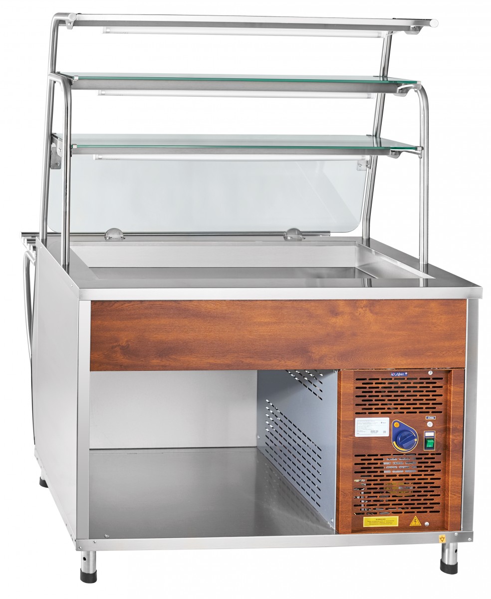 Температура плавно регулируется в диапазоне от 1 до 10 °С. Охлаждаемая ванна имеет большую полезную площадь Поверхность ванны легко подвергается гигиенической чистке Размещенная над прилавком трехъярусная полка используется для выкладывания блюд и напитков, не требующих охлаждения Каждый ярус полки оснащен лампой подсветки Изготовлен из кашированного (декорированного под дерево) металла В комплект к прилавку входят направляющие для подносов Прилавок оснащен регулируемыми по высоте ножками Технические характеристики