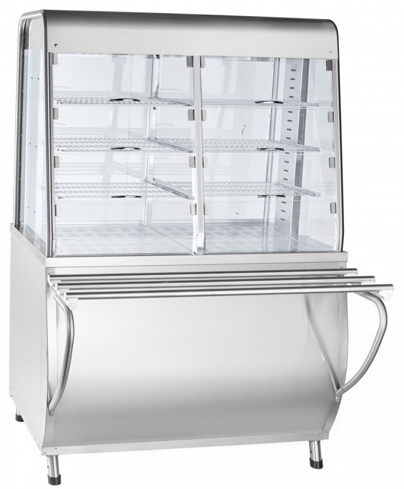 Внутреннее пространство обогревается теплым воздушным потоком или паром, который поступает из ванны, подогреваемой ТЭНами. В витрине установлен вентилятор, который равномерно распределяет воздух Все элементы конструкции выполнены из высококачественной нержавеющей стали Оборудован лампами подсветки Регулируемыми по высоте ножки Технические характеристики: