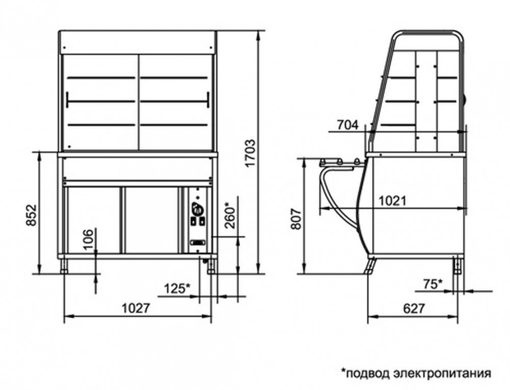 Номинальное напряжение: 230 В Род тока: однофазный, переменный Частота тока: 50 Гц Количество ТЭНов: 2 шт. Количество терморегуляторов: 1 шт. Расход электроэнергии для поддерживания температуры: 2 кВт/ч Диапазон регулирования температуры воздуха в витрине (в шкафу) теплового прилавка: 20-60 °С Рабочая температура на полках при установке терморегулятора на 60 °С: - верхних, средних, нижних; - столешницы. 60 °С 120 °С Время разогрева теплового прилавка до рабочей температуры: 40 мин. Объем воды заливаемой в ванну: 5-7 л Влажность воздуха на полках в объеме теплового прилавка: 15-30 % Суммарная комбинированная освещенность в витрине прилавка: 300 ЛК Полезный объем витрины: 0,41 м³ Демонстрационная площадь витрины: 1,34 м² Габаритные размеры: 1120х770х1700 мм Масса: 140 кг