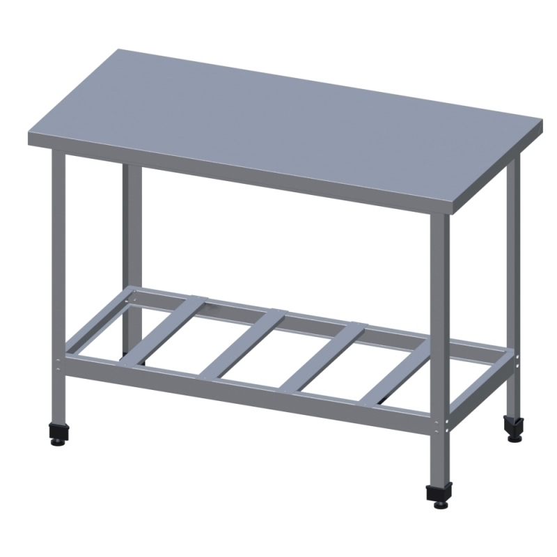 Стол производственный предназначен для обработки продуктов питания на предприятиях пищевой промышленности и общественного питания, на кухнях супер- и гипермаркетов, отелей, санаториев и галерей. Ножки стола регулируются по высоте.