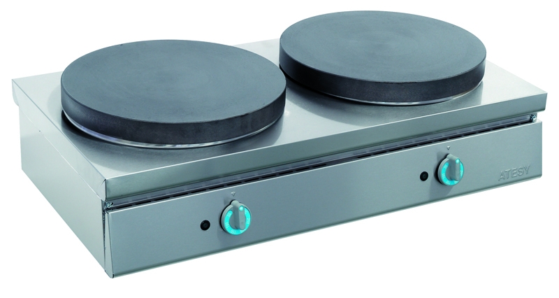 Блинный аппарат представляет собой пьедестал, выполненный из нержавеющей стали, на котором располагаются две жарочные поверхности диаметром 36 см. Конфорки аппарата выполнены из разрешенного для использования в системе общественного питания термостойкого чугуна, что определяет высокую устойчивость поверхности к механическим повреждениям. Производительность – 120 блинов/час. Регулировка температуры поверхности осуществляется с помощью терморегулятора.