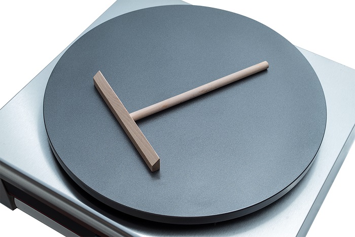 Рабочая поверхность выполнена из чугуна и имеет антипригарное покрытие. Широкий температурный диапазон (до 300°С) позволяет быстрее разогревать поверхность и быстрее приступать к выпечке. Для удобства обслуживания блинница снабжена лотком, в который можно убирать утварь, либо смахивать крошки, которые набираются в течение рабочего дня. В комплекте с блинницей идет Т-образная приспособление для разравнивания теста по поверхности.